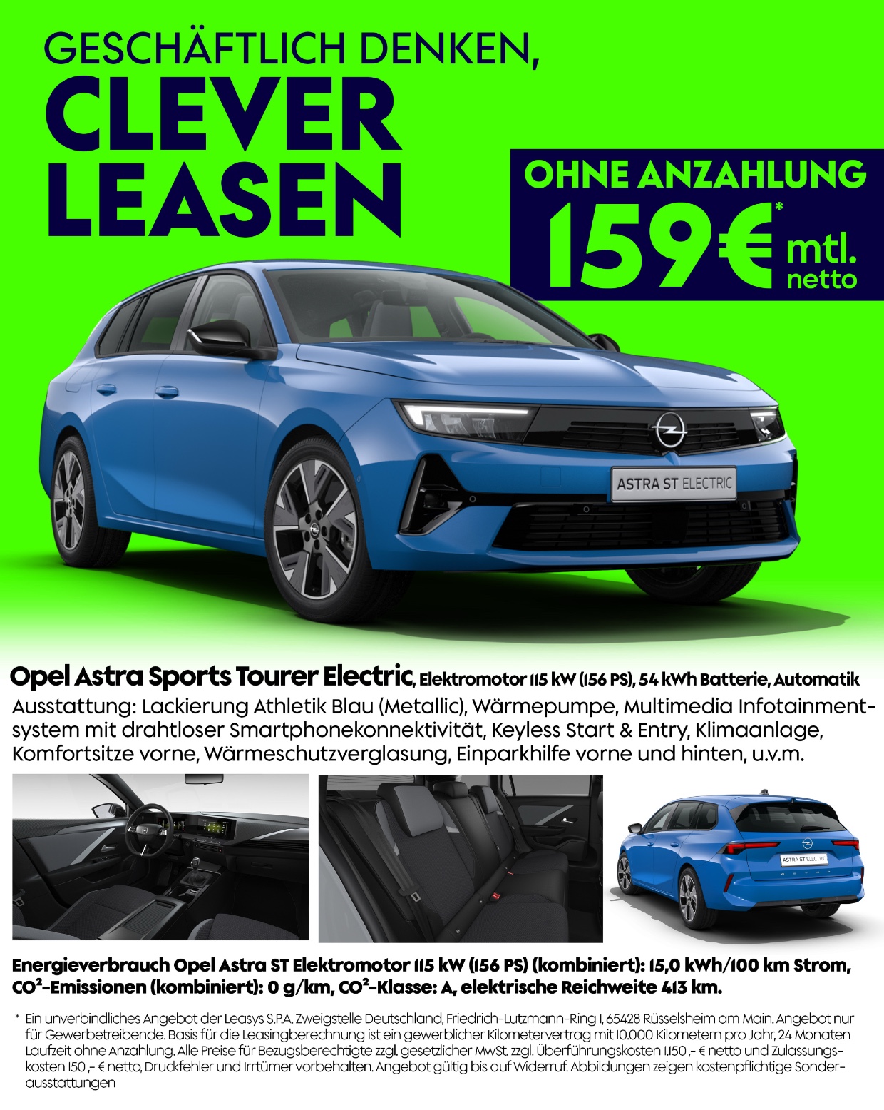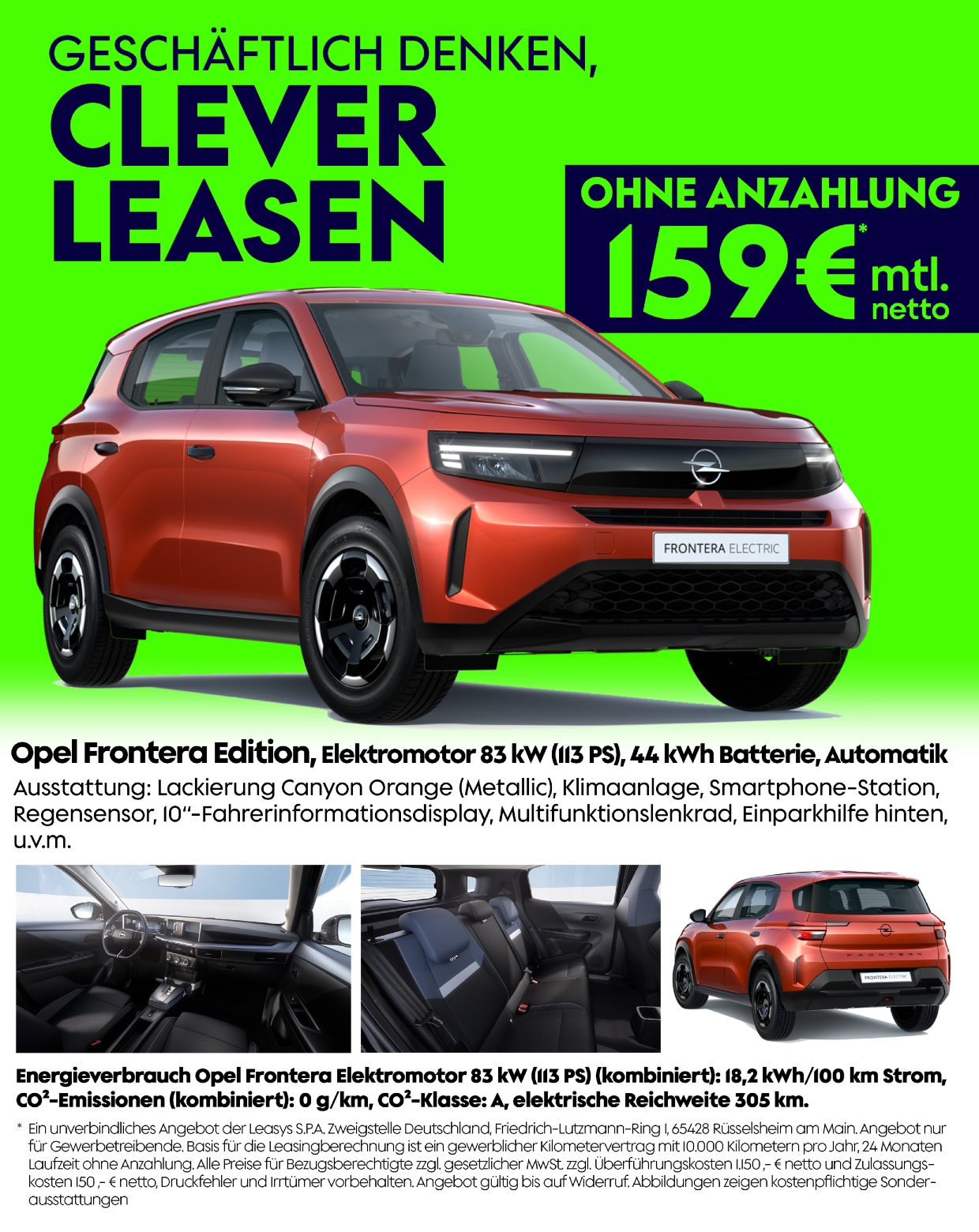 ab 159,00 Euro Leasingrate zzgl. MwSt. keine Anzahlung, keine Restzahlung, 10.000 km pro Jahr, abweichende Regelung möglich. Details bitte dem Flyer entnehmen.