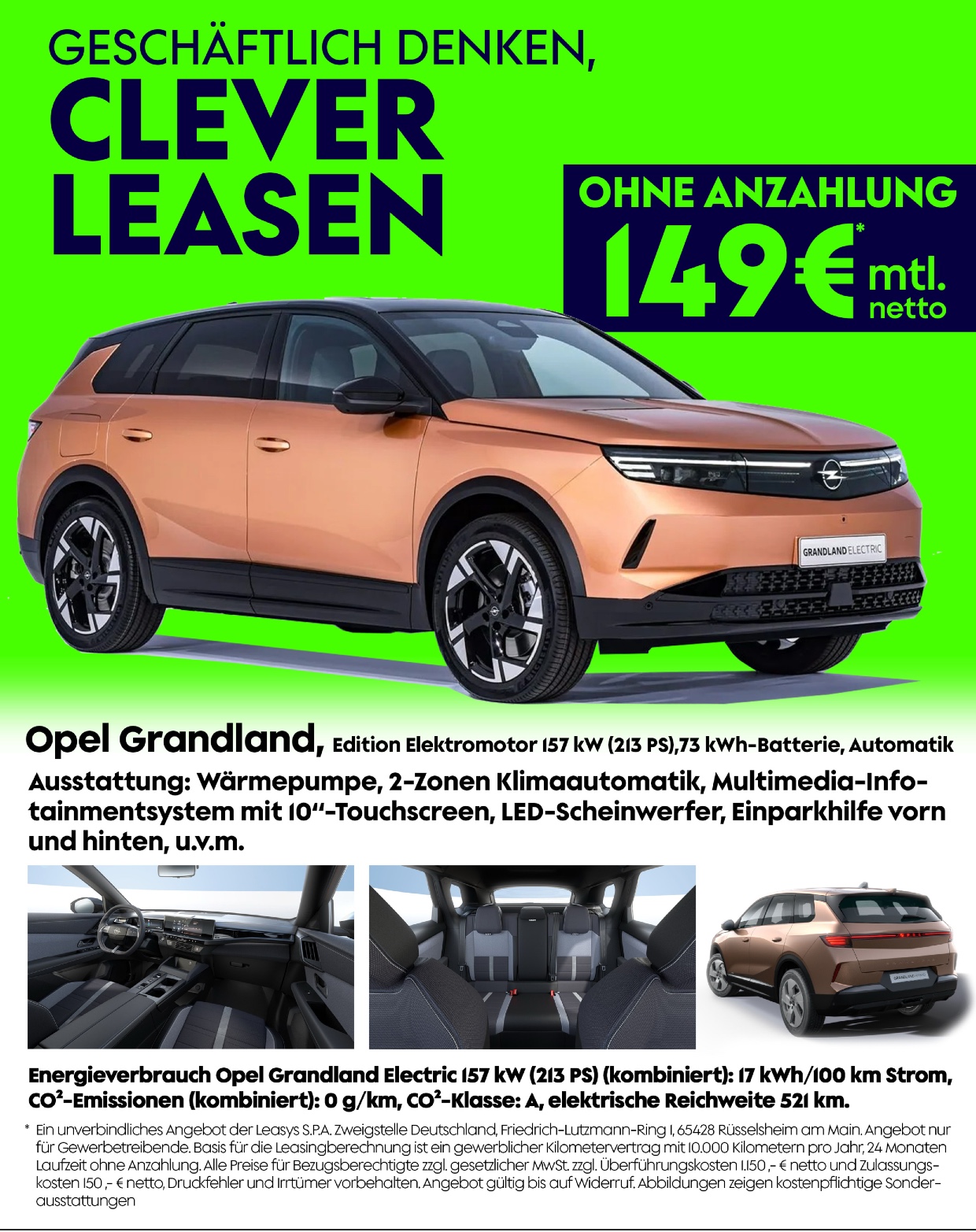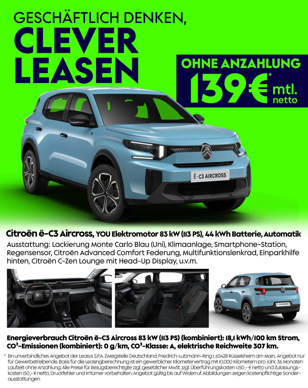 ab 139,00 Euro Leasingrate zzgl. MwSt. keine Anzahlung, keine Restzahlung, 10.000 km pro Jahr, abweichende Regelung möglich. Details bitte dem Flyer entnehmen.