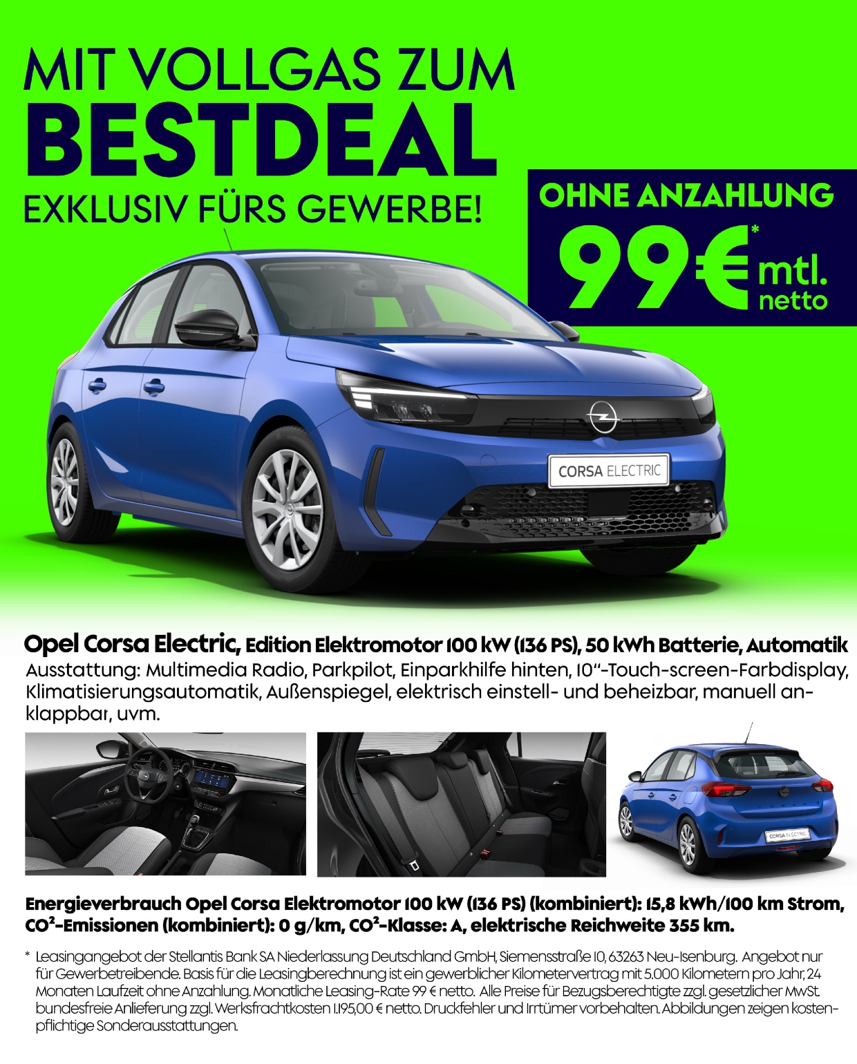 ab 99,00 Euro Leasingrate zzgl. MwSt. keine Anzahlung, keine Restzahlung, 10.000 km pro Jahr, abweichende Regelung möglich. Details bitte dem Flyer entnehmen.